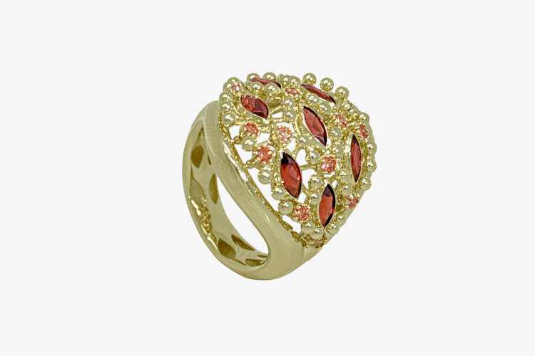 Prsten luksuznog izgleda izrađen da bude volumenski praktičan i nosiv sa Granat i Shampagne cubik cirkoniom koja ga krasi na kruni.