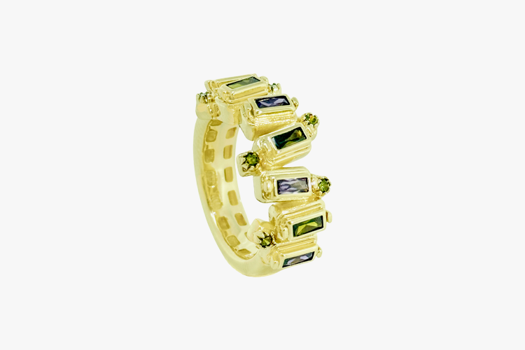 Prsten neobičnih ravnih linija koje svojim položajem prave asimertiju. Detalji koji krase površinu su izrađeni od Ametista i Peridot kamena.